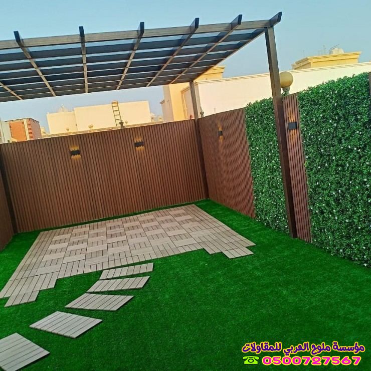 تضفي لمسة دافئة وطبيعية على المكان. يفضل دائماً اختيار خشب "التيك" أو الخشب المعالج (WPC) لقدرته العالية على تحمل الرطوبة والحرارة دون الحاجة لصيانة مستمرة.